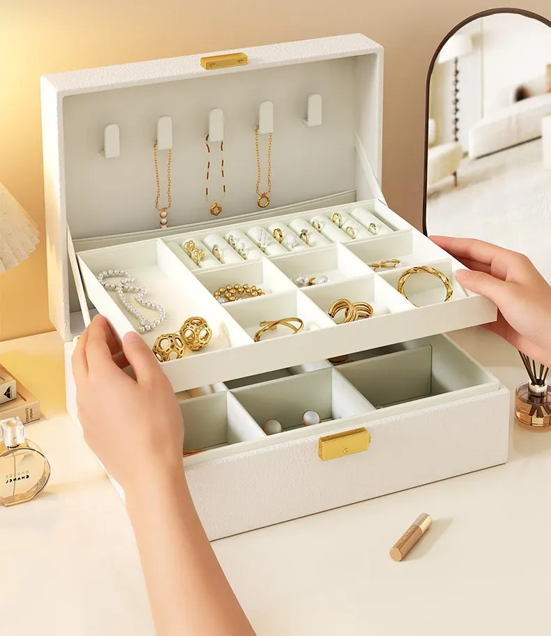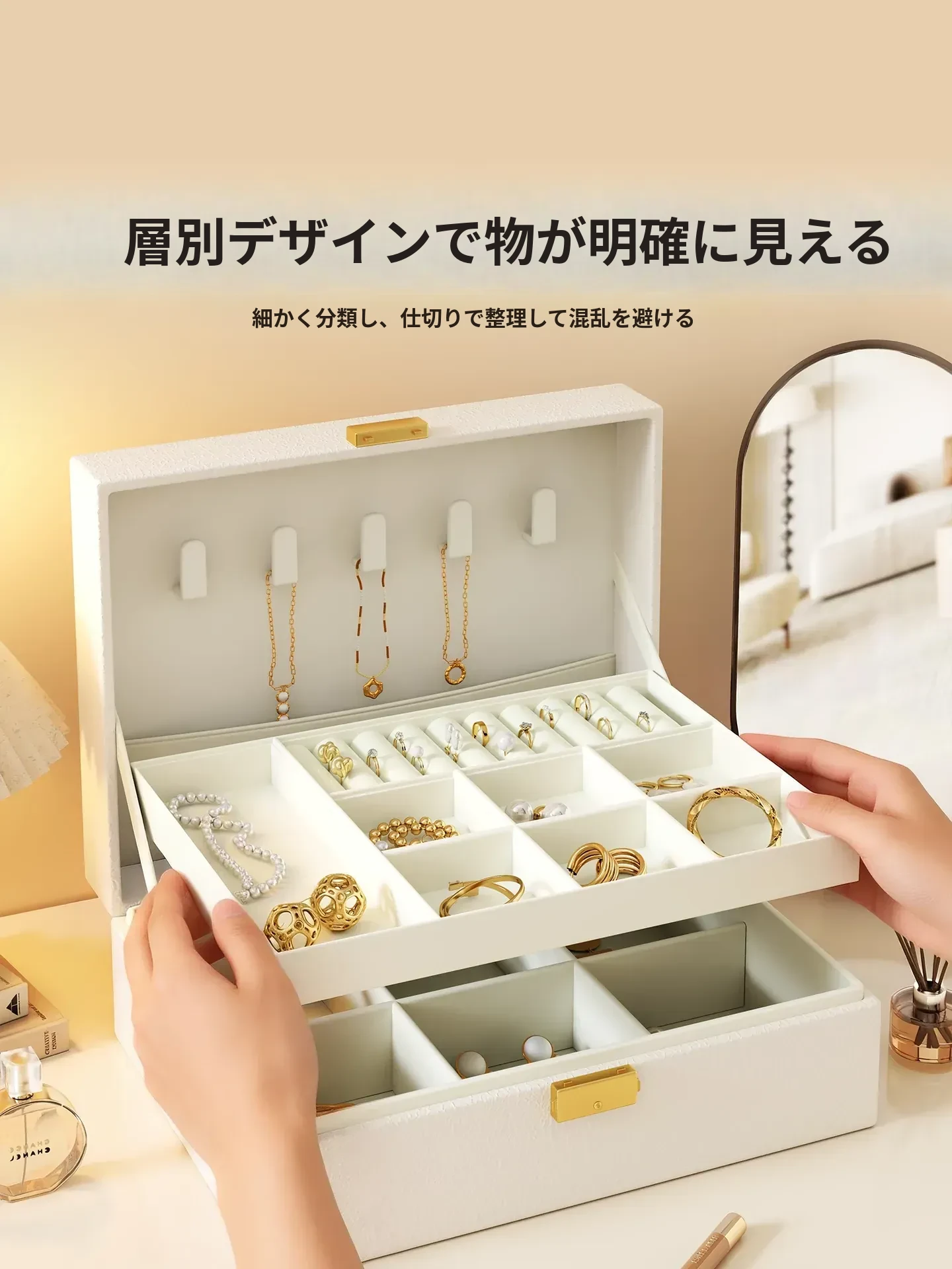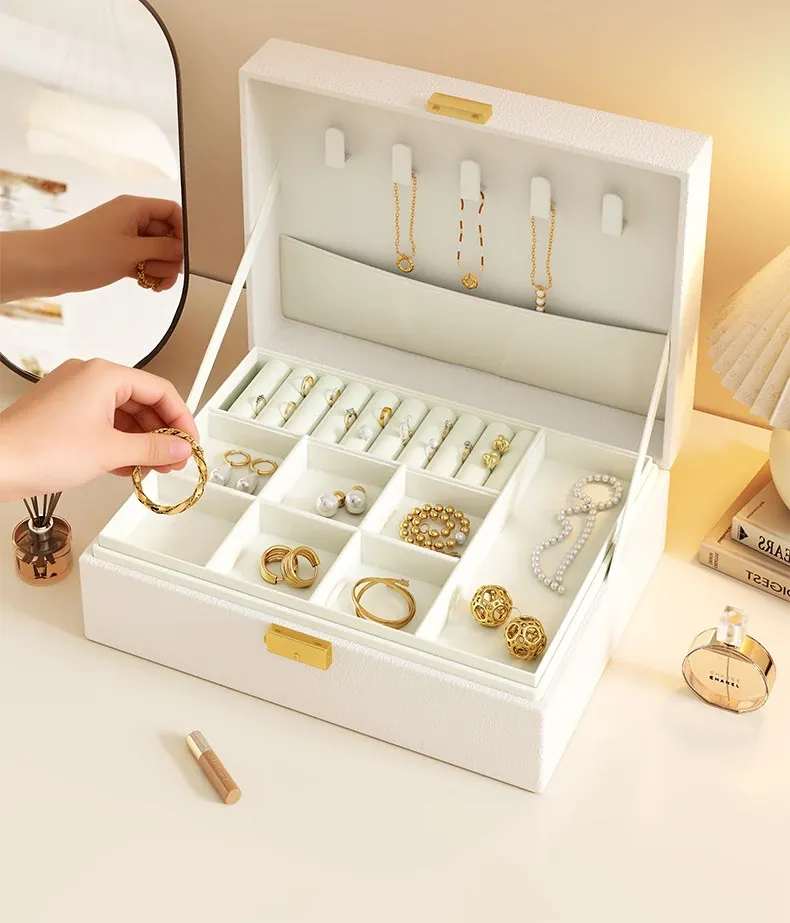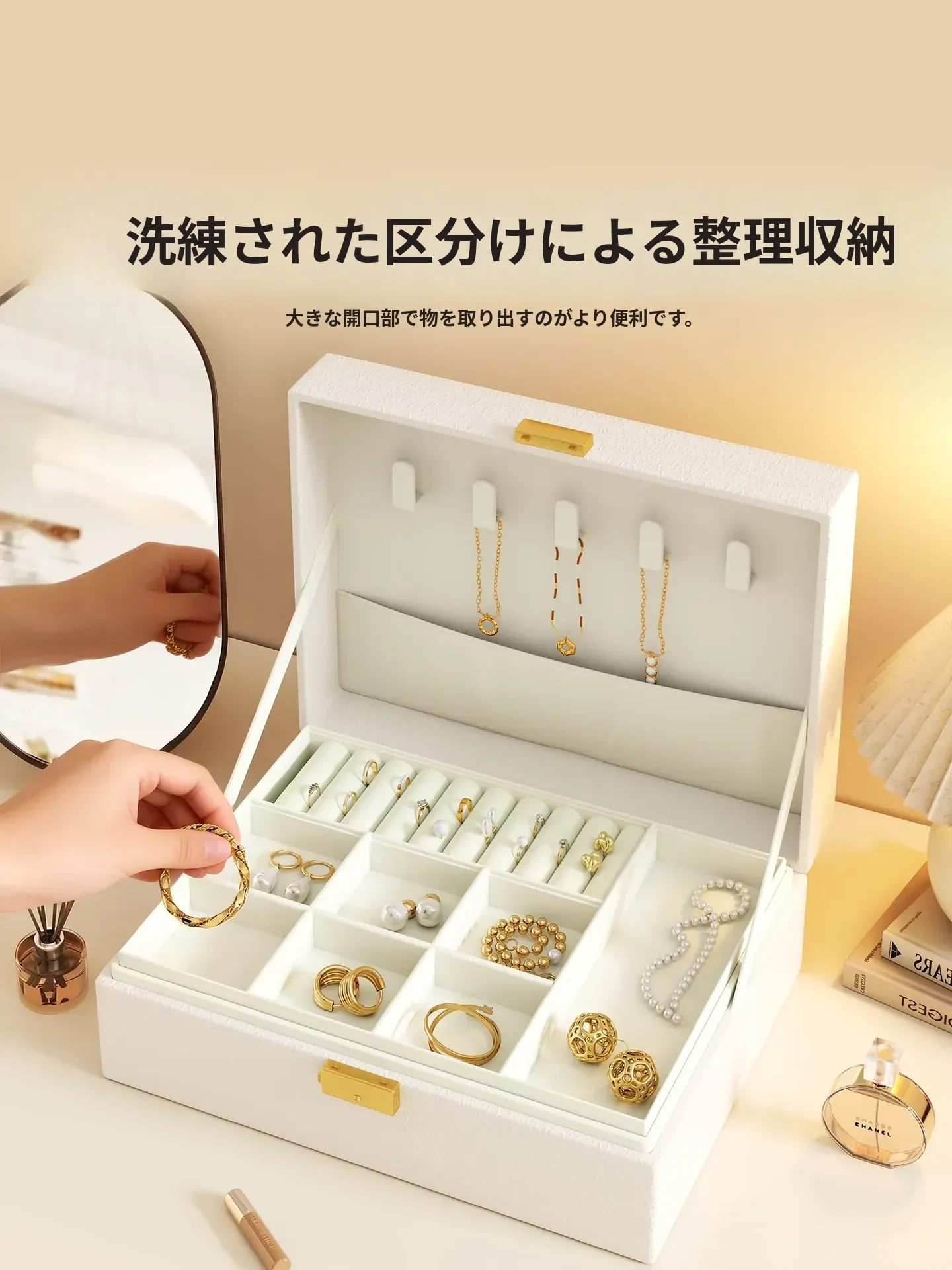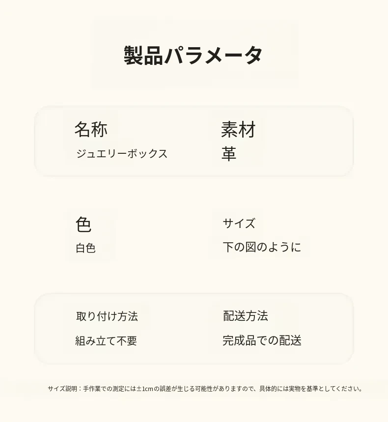 高級感溢れるクリーム風ジュエリーボックス - 精巧なイヤリングやネックレス、リングを美しく収納!新作のアクセサリー収納ボックスで、あなたの大切な宝物をスタイリッシュに保管しましょう。