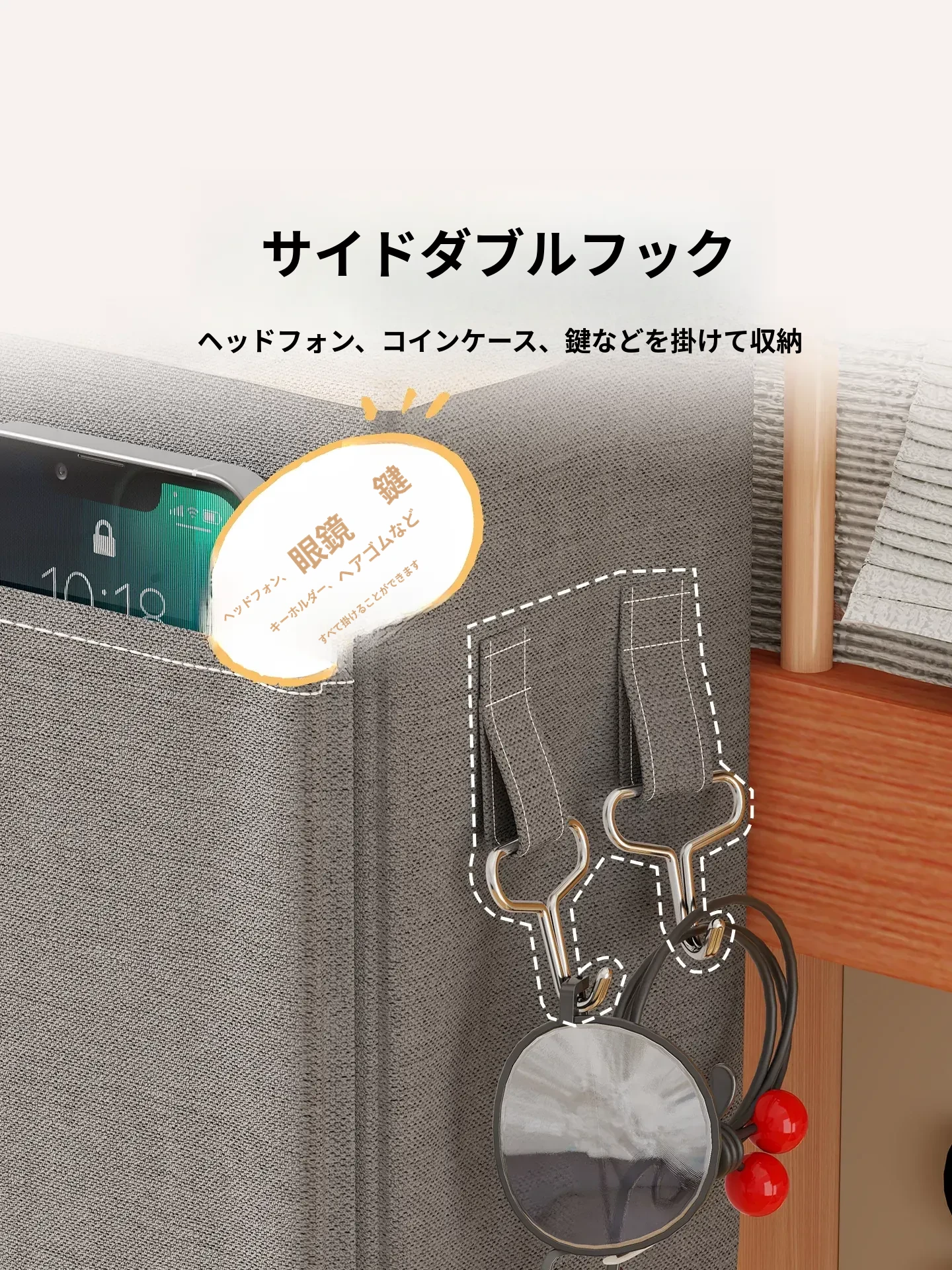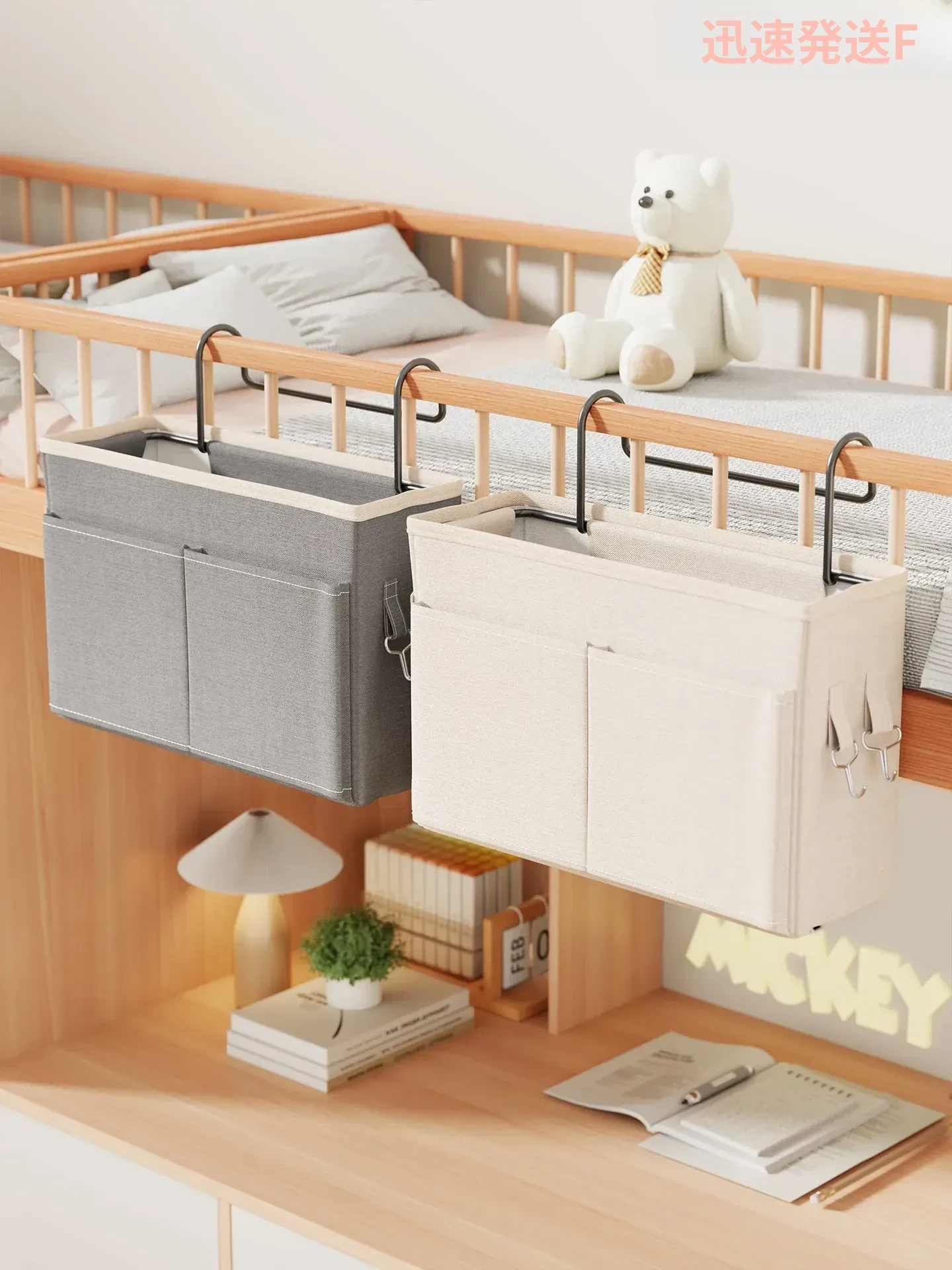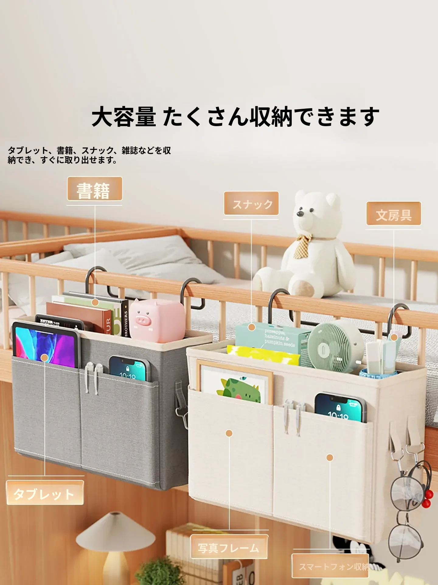 宿舎用ベッドサイド収納ポケット - 穴を開けずに簡単取り付け!上段用の分割式ハンギングファブリック収納バッグで、寝室をスッキリ整理!