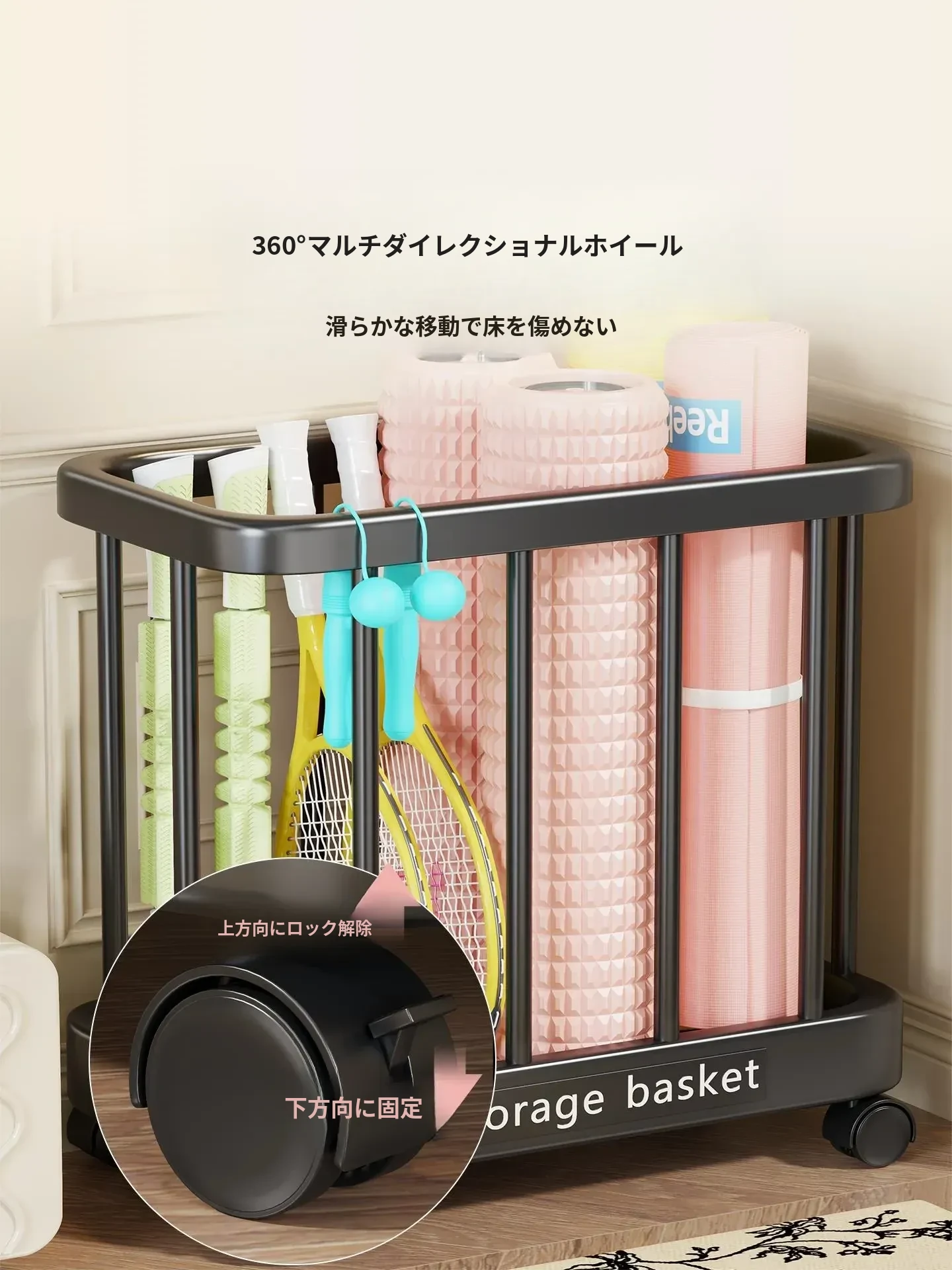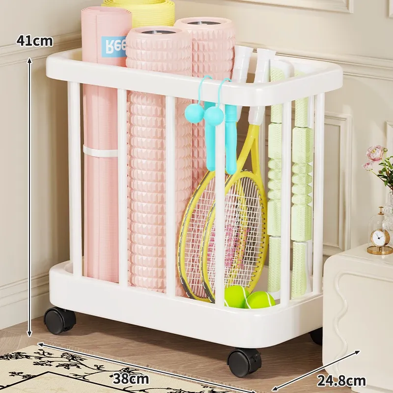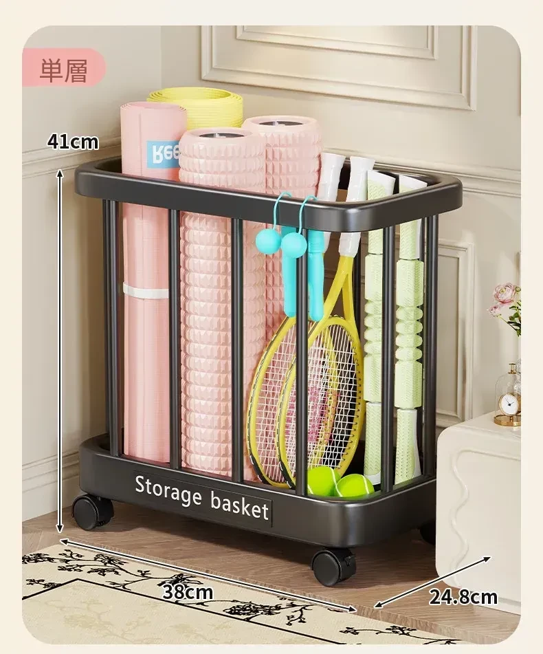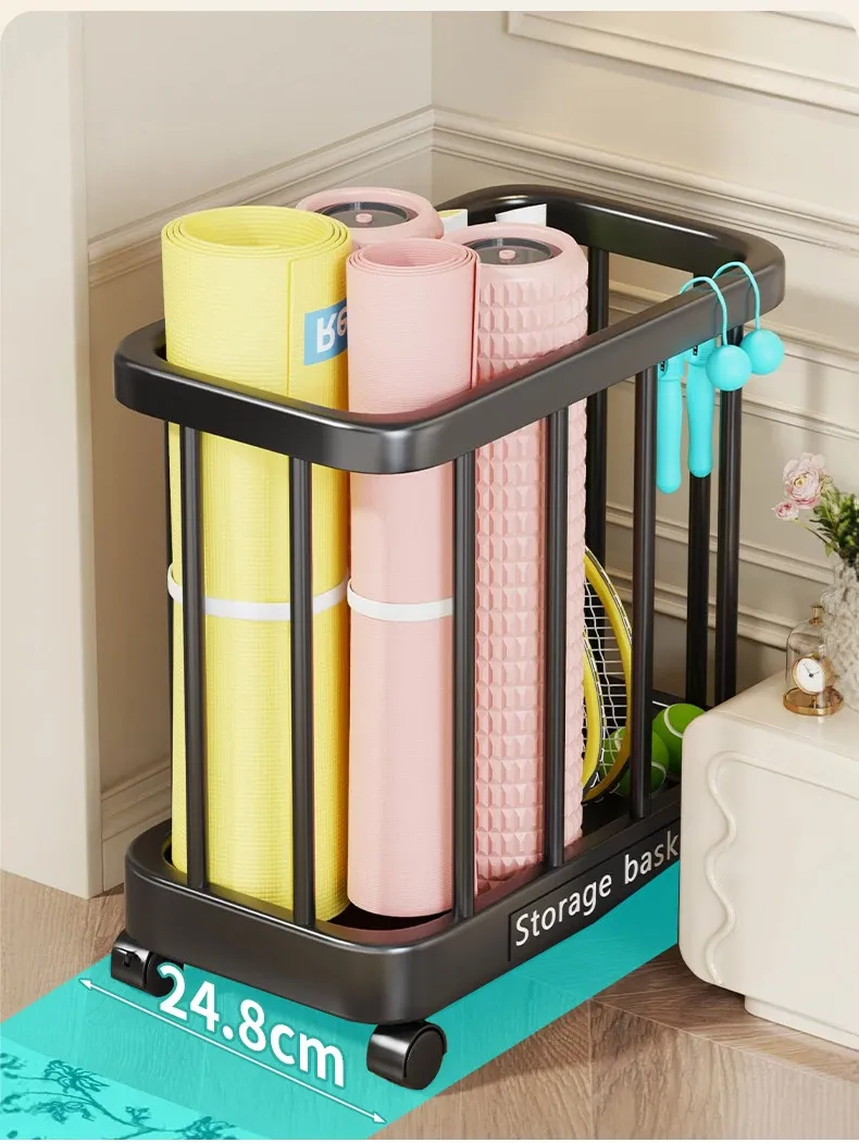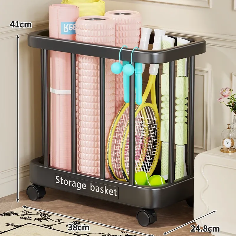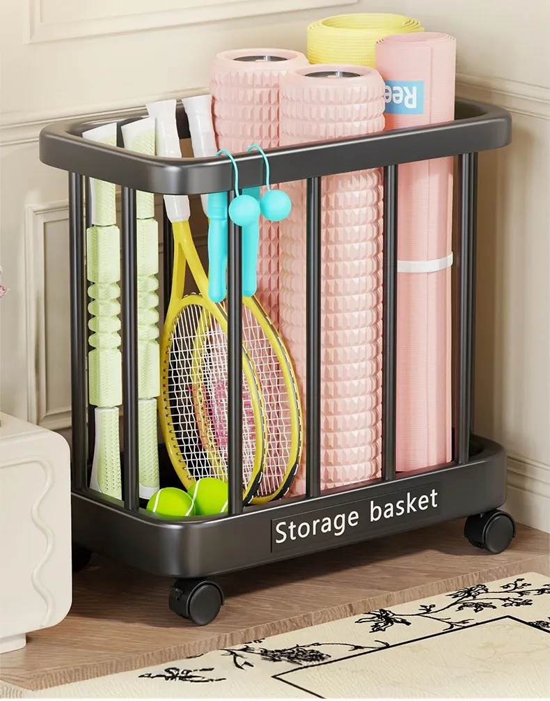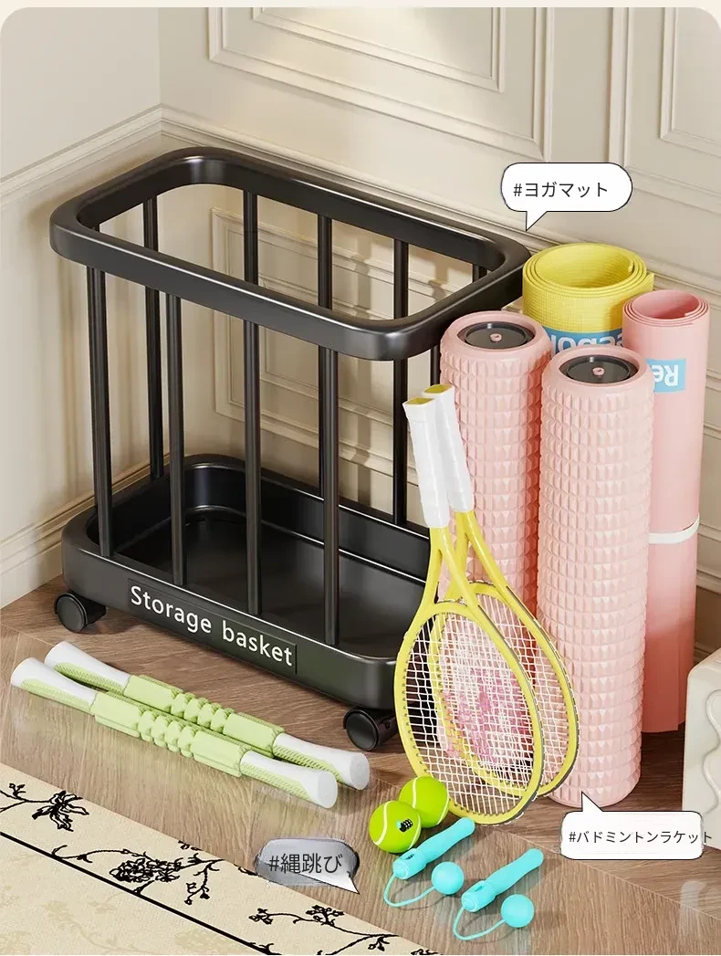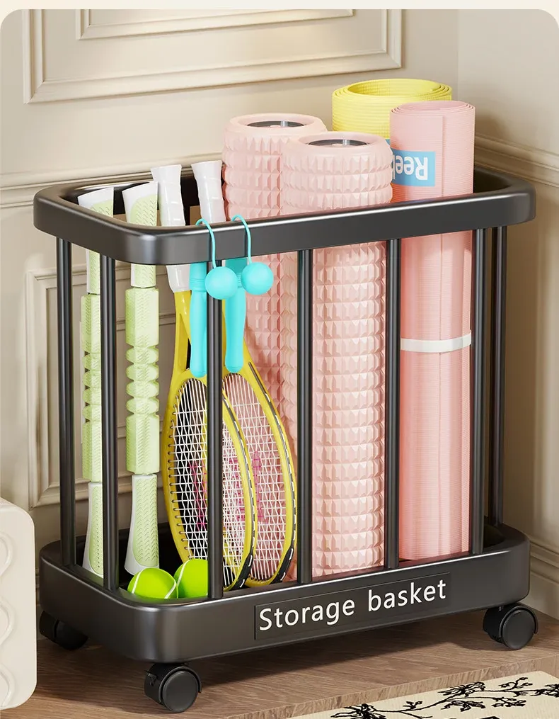 ヨガマット収納バスケット - 移動可能なキャスター付き!家庭用スポーツ用品、フィットネス機器、バドミントンラケット収納に最適!整理整頓が簡単で、運動をより快適にサポートします。