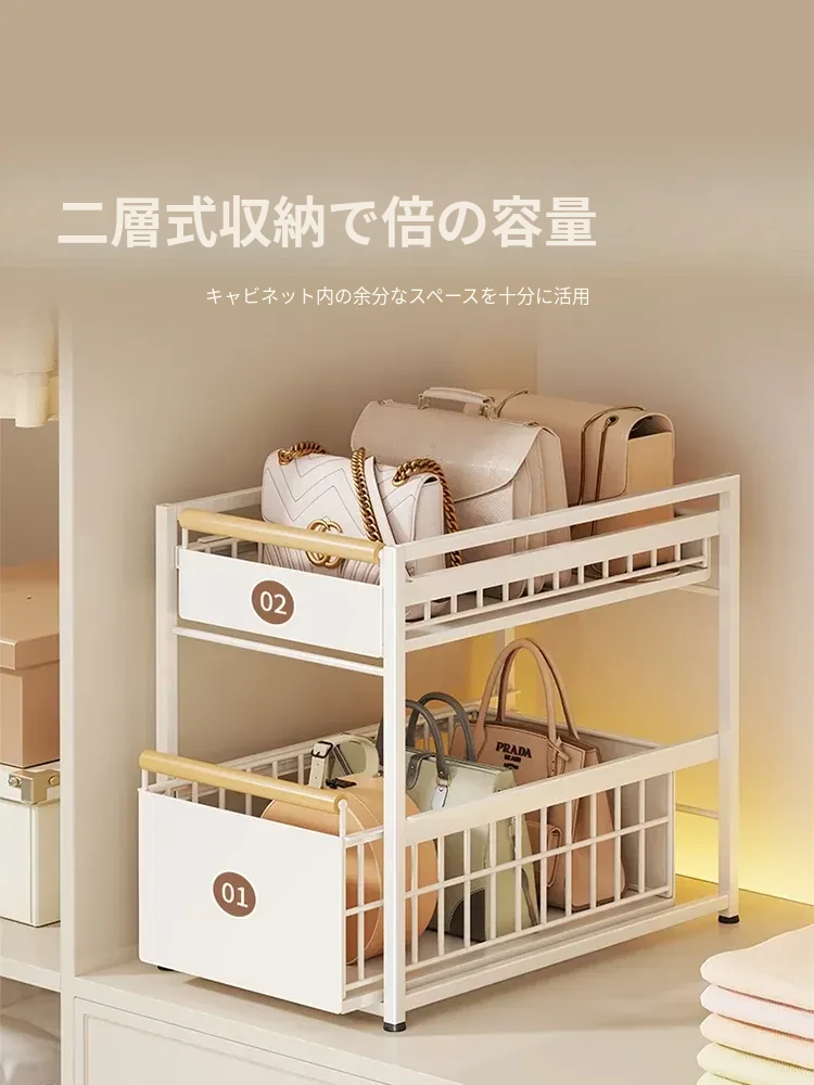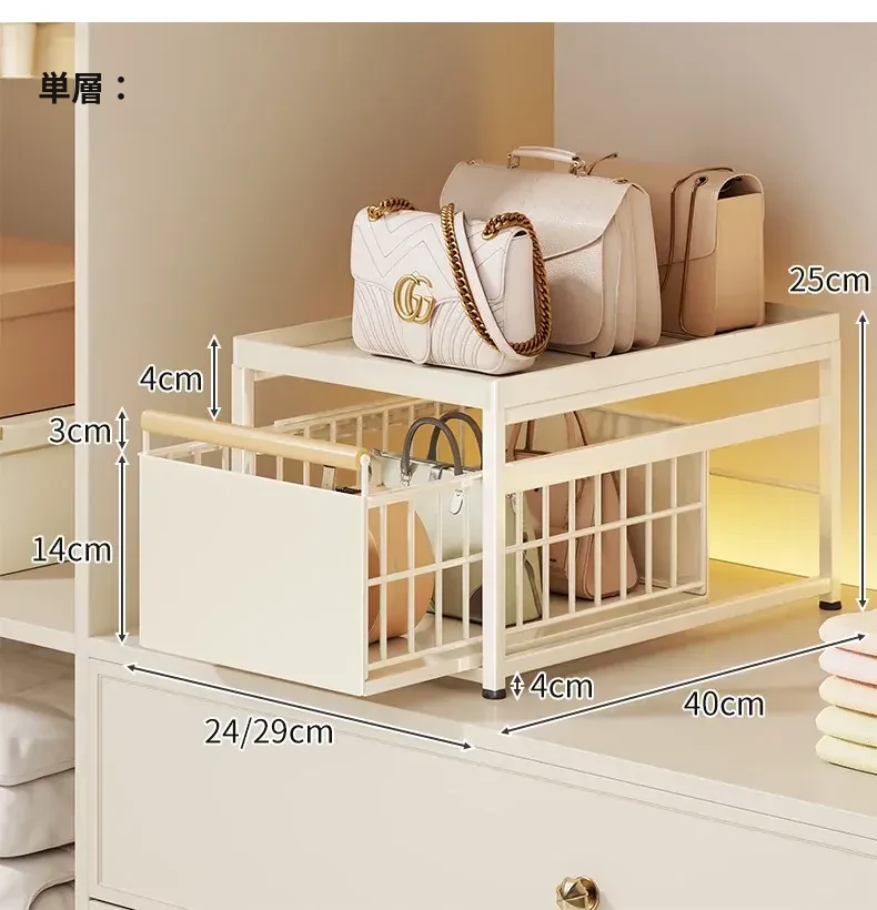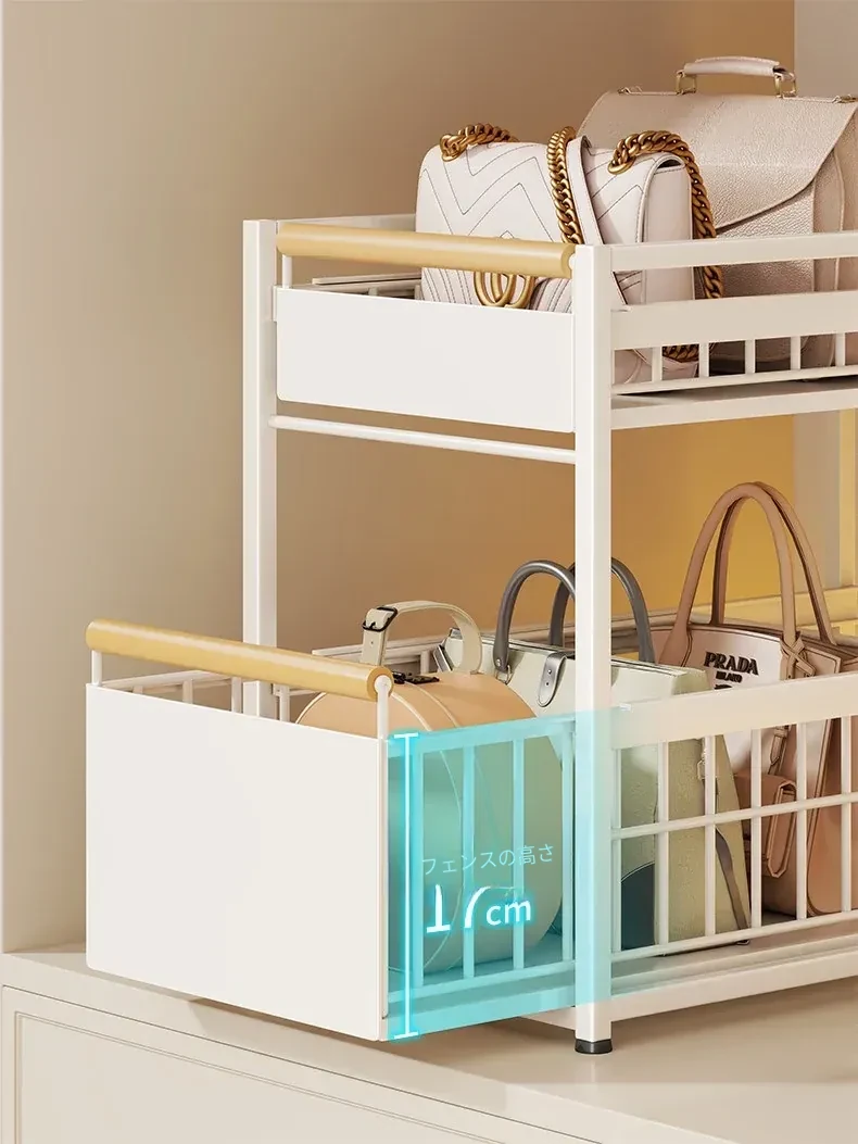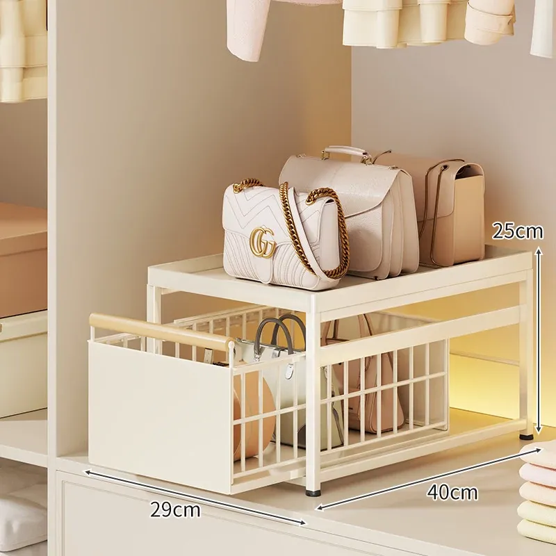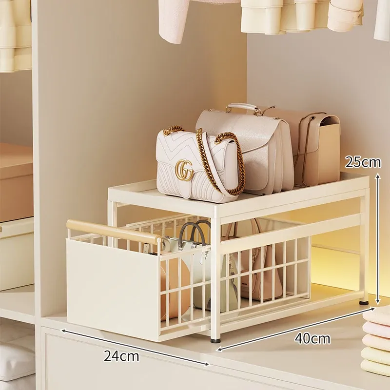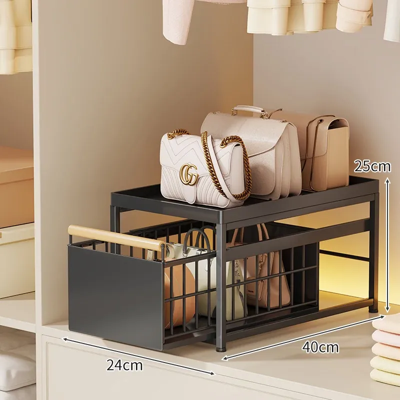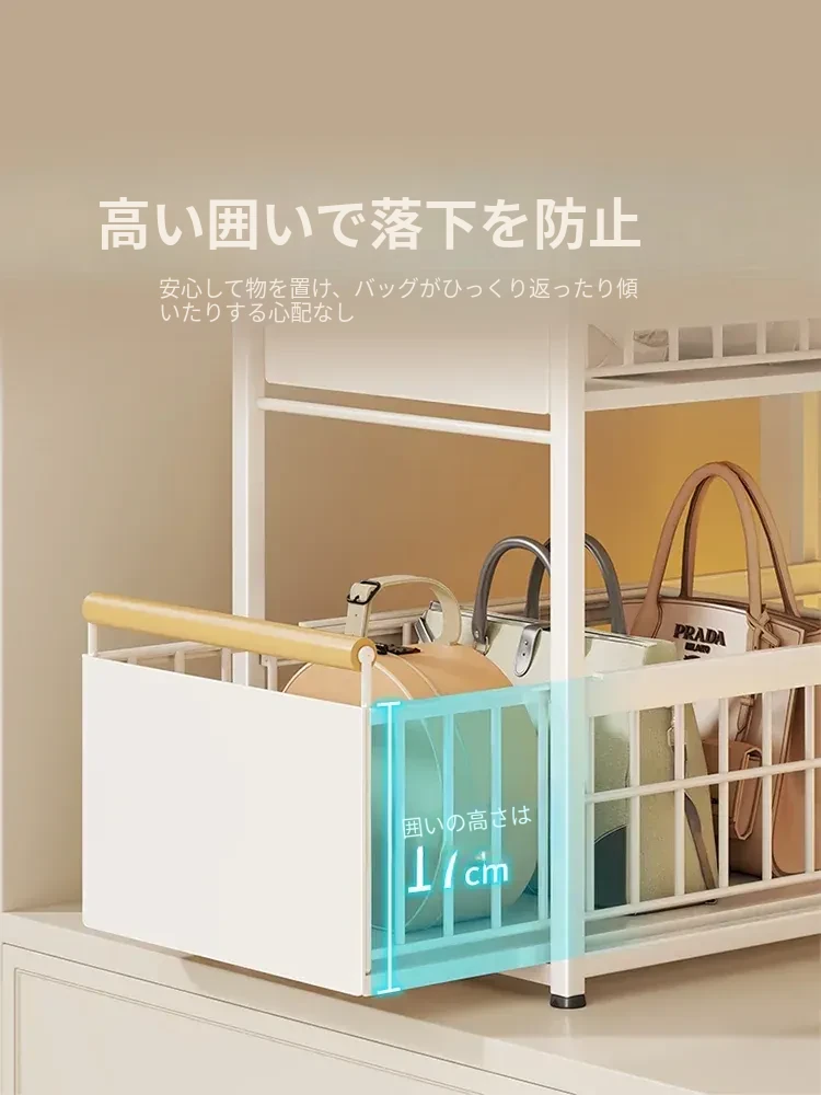 バッグ収納ラック - 引き出せるデザインで、皮バッグや小物をスッキリ整理!おしゃれなインテリアにもぴったりな仕切り付き収納棚で、全てのバッグを効率良く収納できます。これであなたのクローゼットもすっきり!