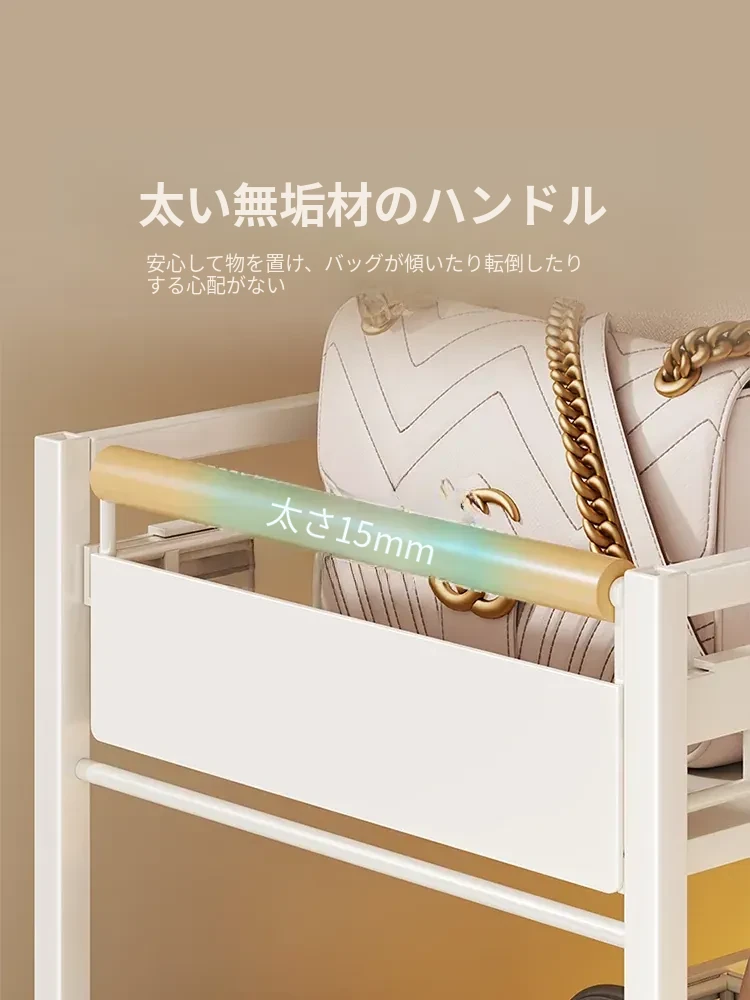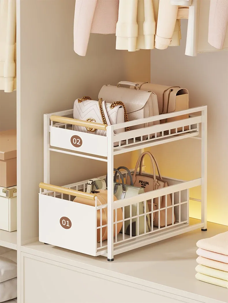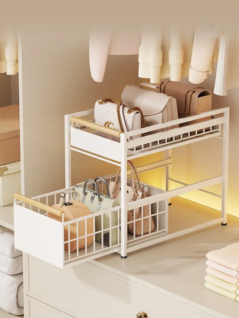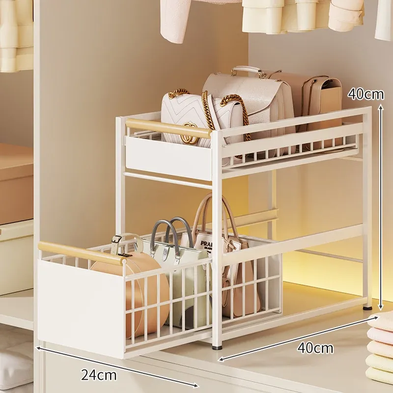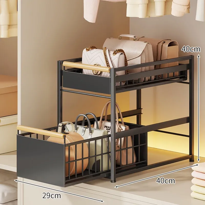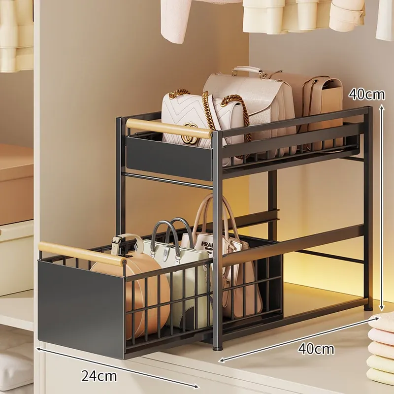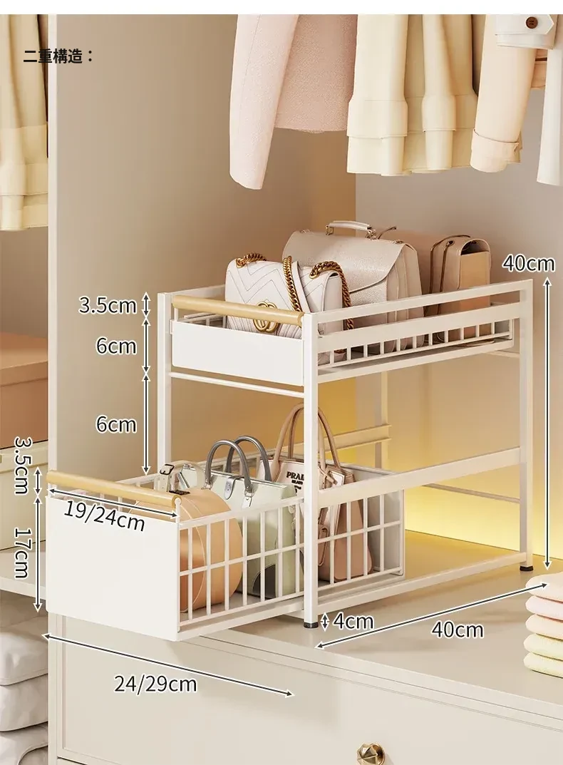 バッグ収納ラック - 引き出せるデザインで、皮バッグや小物をスッキリ整理!おしゃれなインテリアにもぴったりな仕切り付き収納棚で、全てのバッグを効率良く収納できます。これであなたのクローゼットもすっきり!
