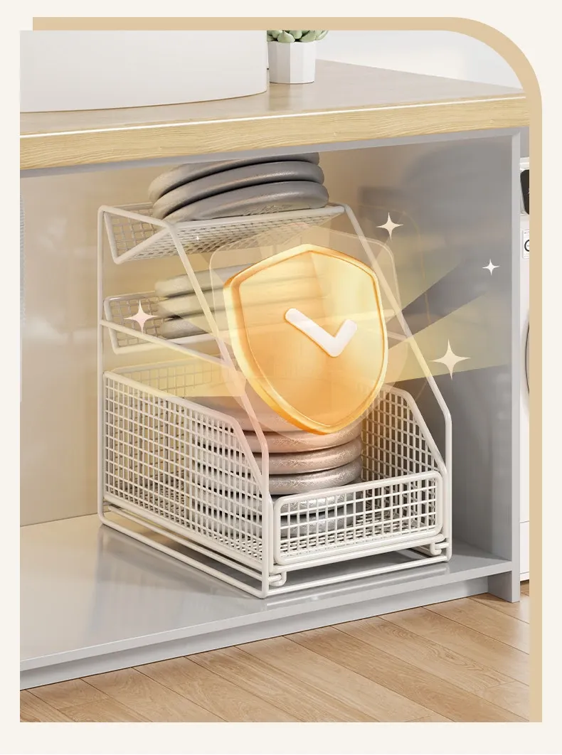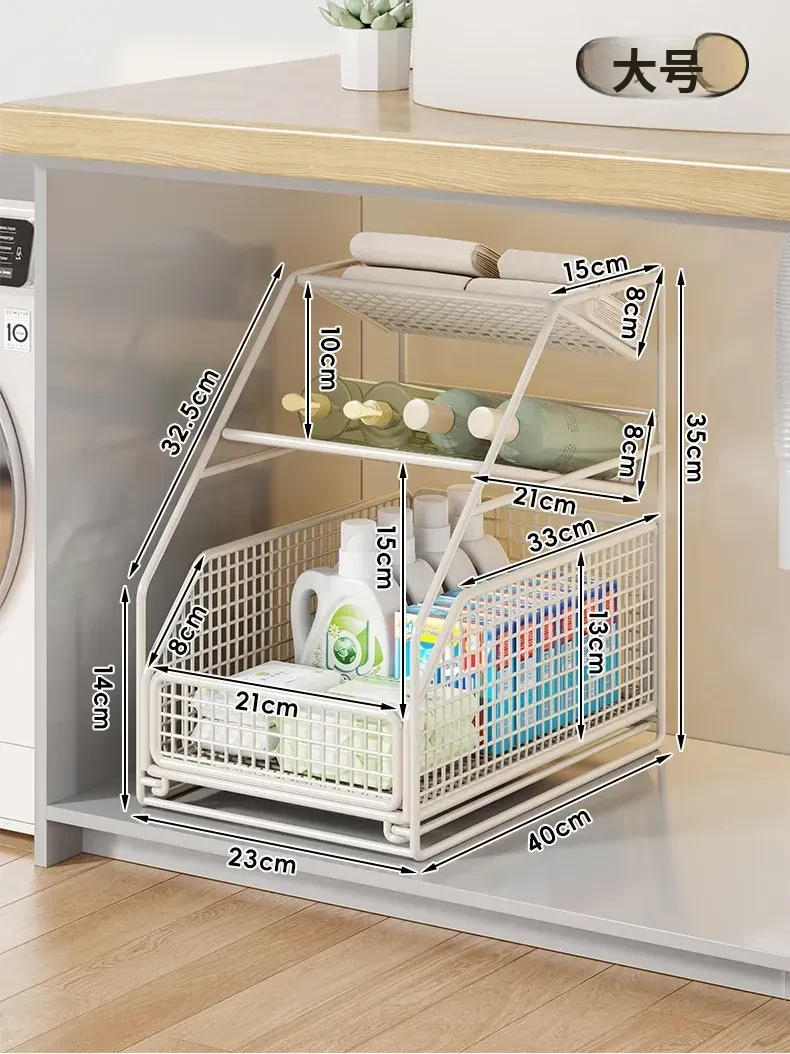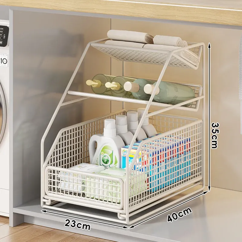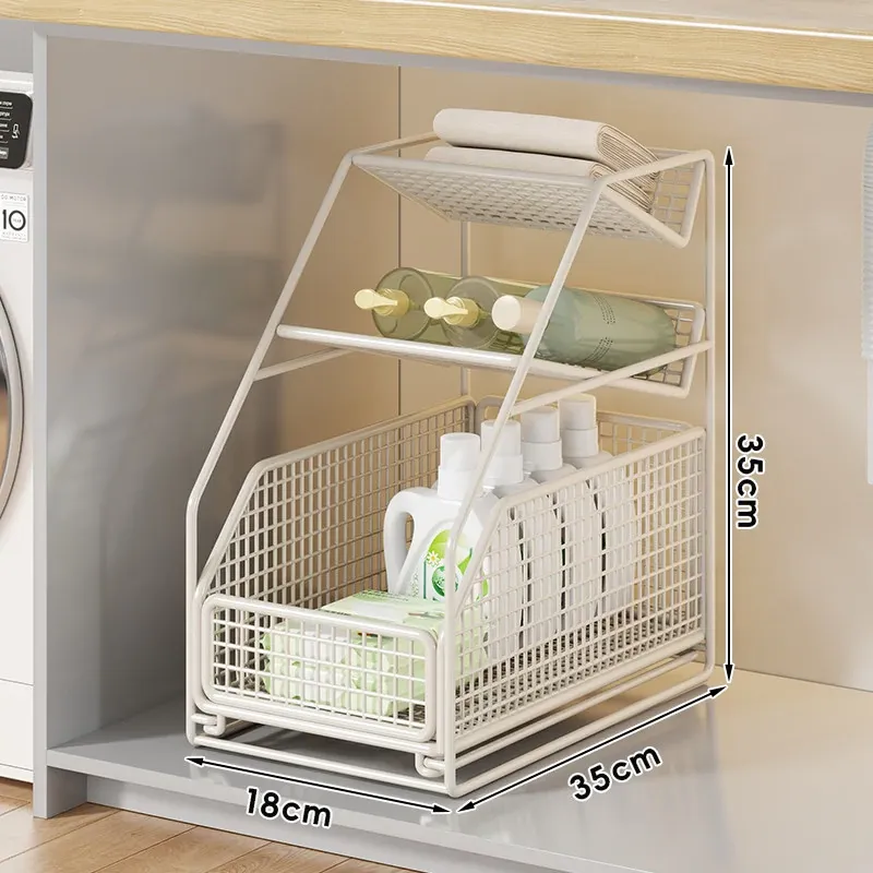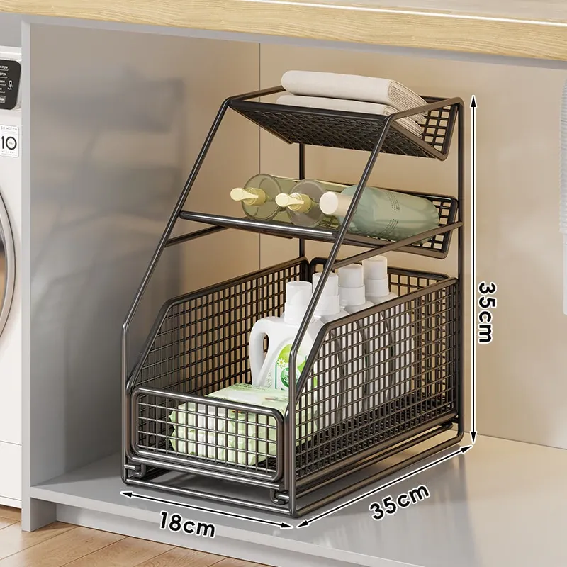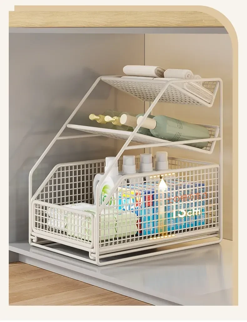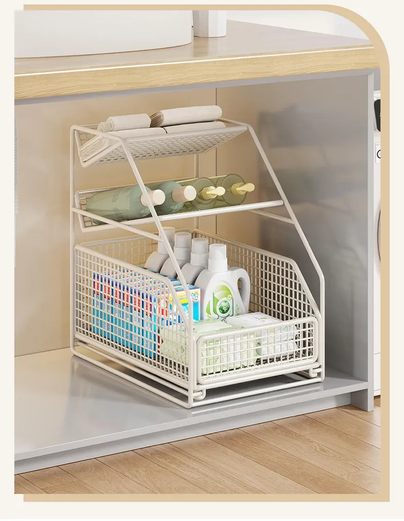 下水槽収納ラック - バスルームや洗面台に最適!引き出し式の多段ラックで、トイレもスッキリ整理。スペースを有効活用し、必要なものがすぐに取り出せる便利な収納アイテムです!