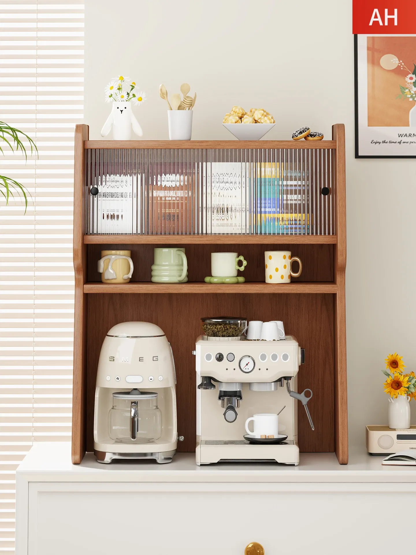 デスクトップコーヒーメーカー用収納ラック - おしゃれなダイニングテーブル用コーヒー器具スタンド、水杯ホルダー、マルチレイヤー収納キャビネットで、あなたのコーヒータイムをスタイリッシュに演出!