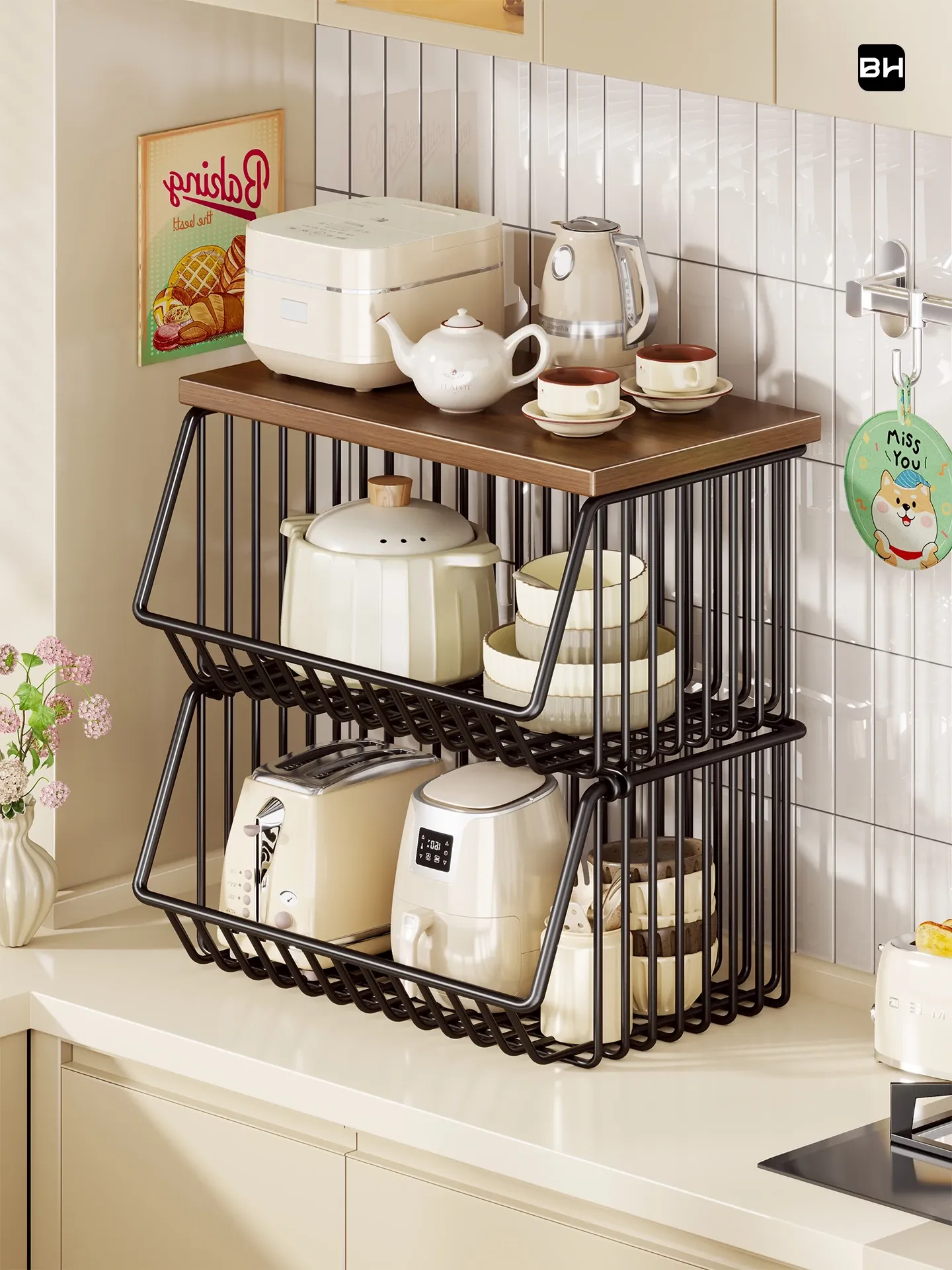 キッチン収納ラック・サイドボード用野菜・果物バスケット付き!リビングでも使える移動式・多層設計で水杯やスナックをスッキリ整理!便利でスタイリッシュな収納マジックを手に入れよう!