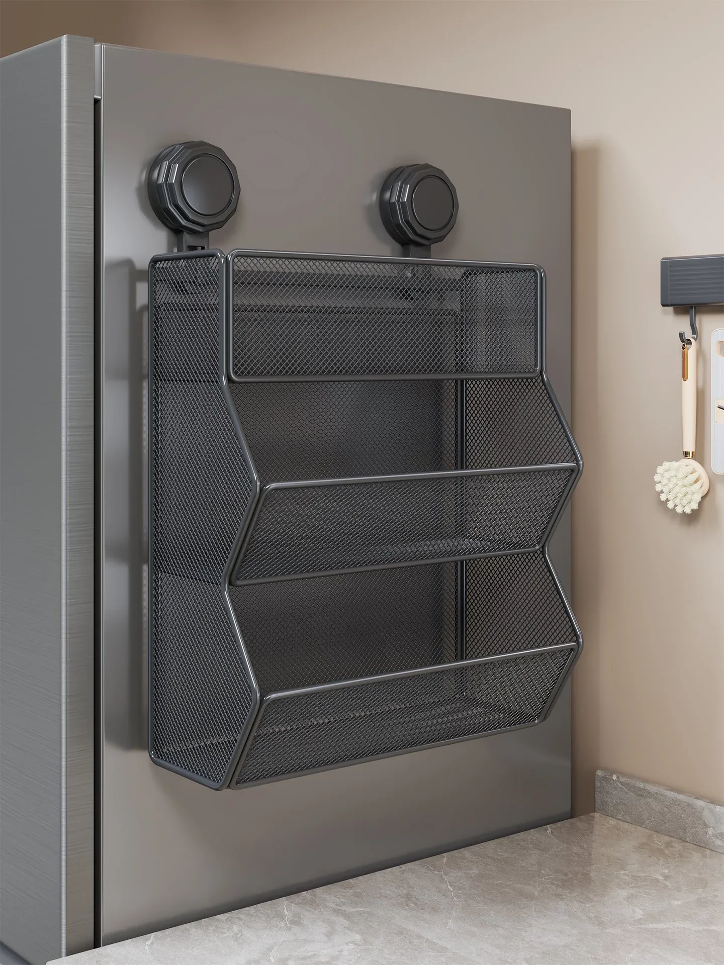 キッチンに最適!穴を開けずに簡単取り付け、吸盤式の多機能収納ラック。冷蔵庫や壁にぴったりフィット、調味料や小物をすっきり整理できる多層型収納棚!