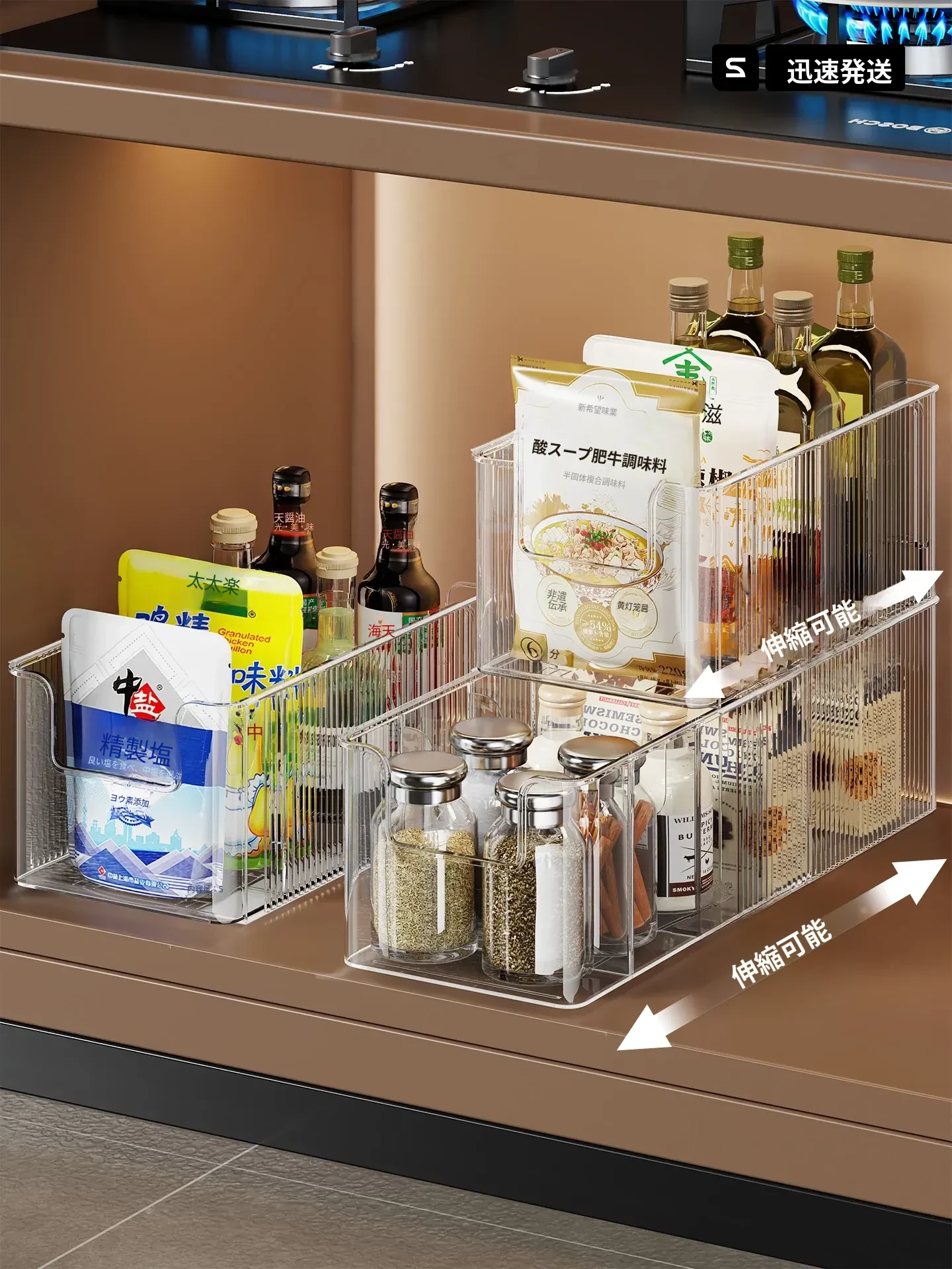 伸縮式調味料収納ボックス - 透明ボトルで見やすく、整理整頓に最適!調味料をすっきり収納できる分格袋付きで、キッチンがスッキリ整います。使いやすいデザインで、料理がもっと楽しくなるアイテムです!