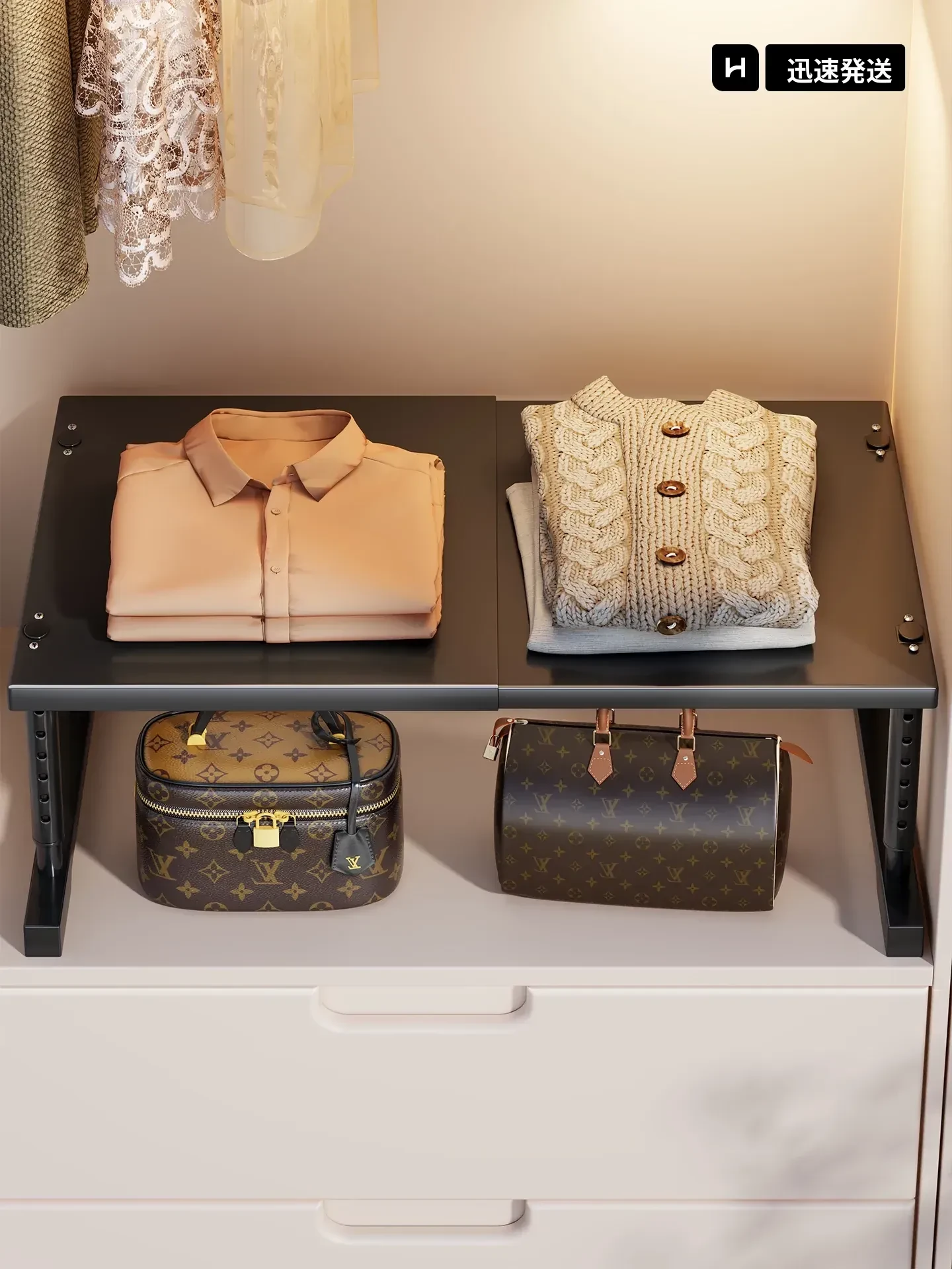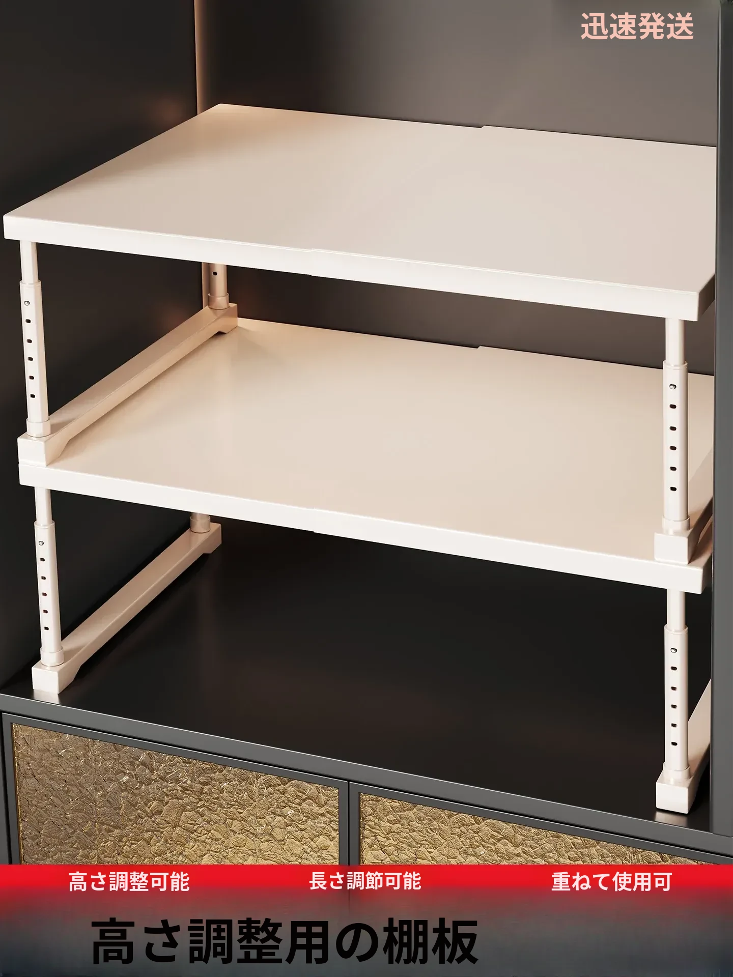 伸縮可能な衣類収納棚!靴やキッチン用品もすっきり整理できる分け棚。クローゼットやキャビネット内でのスペースを有効活用し、快適な収納生活を実現します!