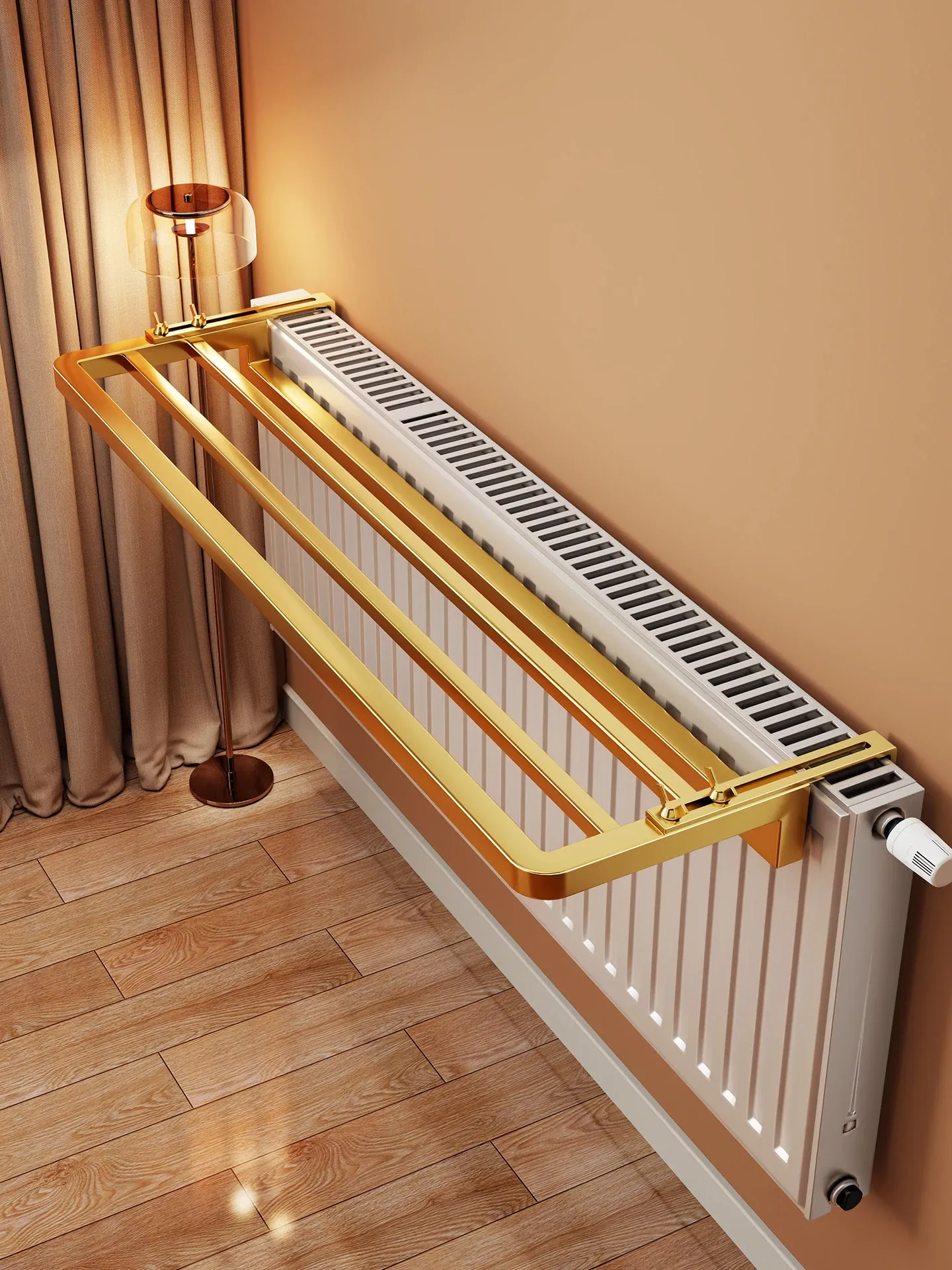 暖房用衣類乾燥ラック - 省スペースで効率的に衣類を干せる!暖房パイプの上にぴったりフィットし、収納力も抜群。快適なお部屋で、いつでも清潔な衣類を!