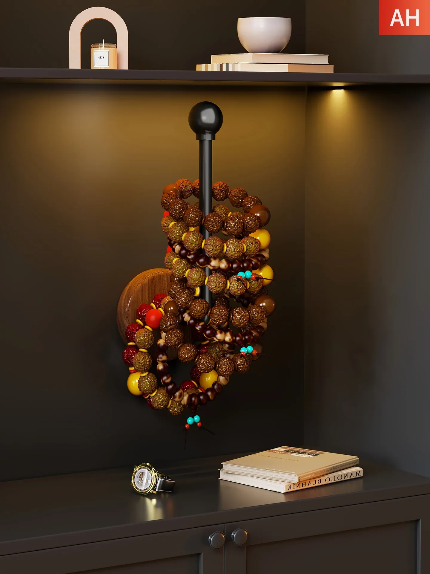 クルミの木製アクセサリースタンド|ヘアゴム・髪留め・手持ちの文玩・仏珠・サメクリップ用の壁掛け収納ラック|おしゃれで機能的な掛けフック付き!お部屋をスッキリ整理整頓!